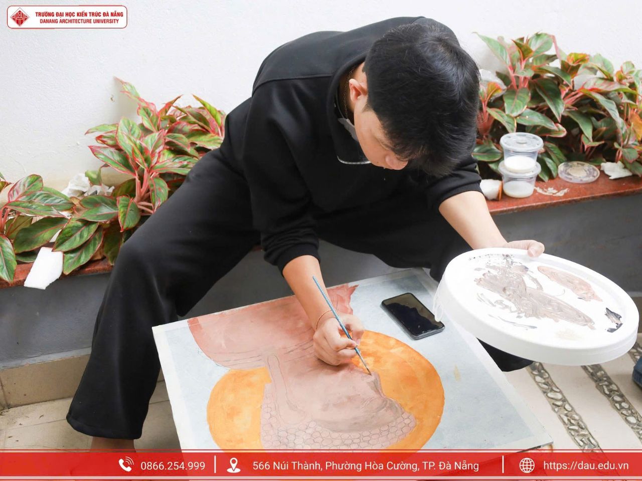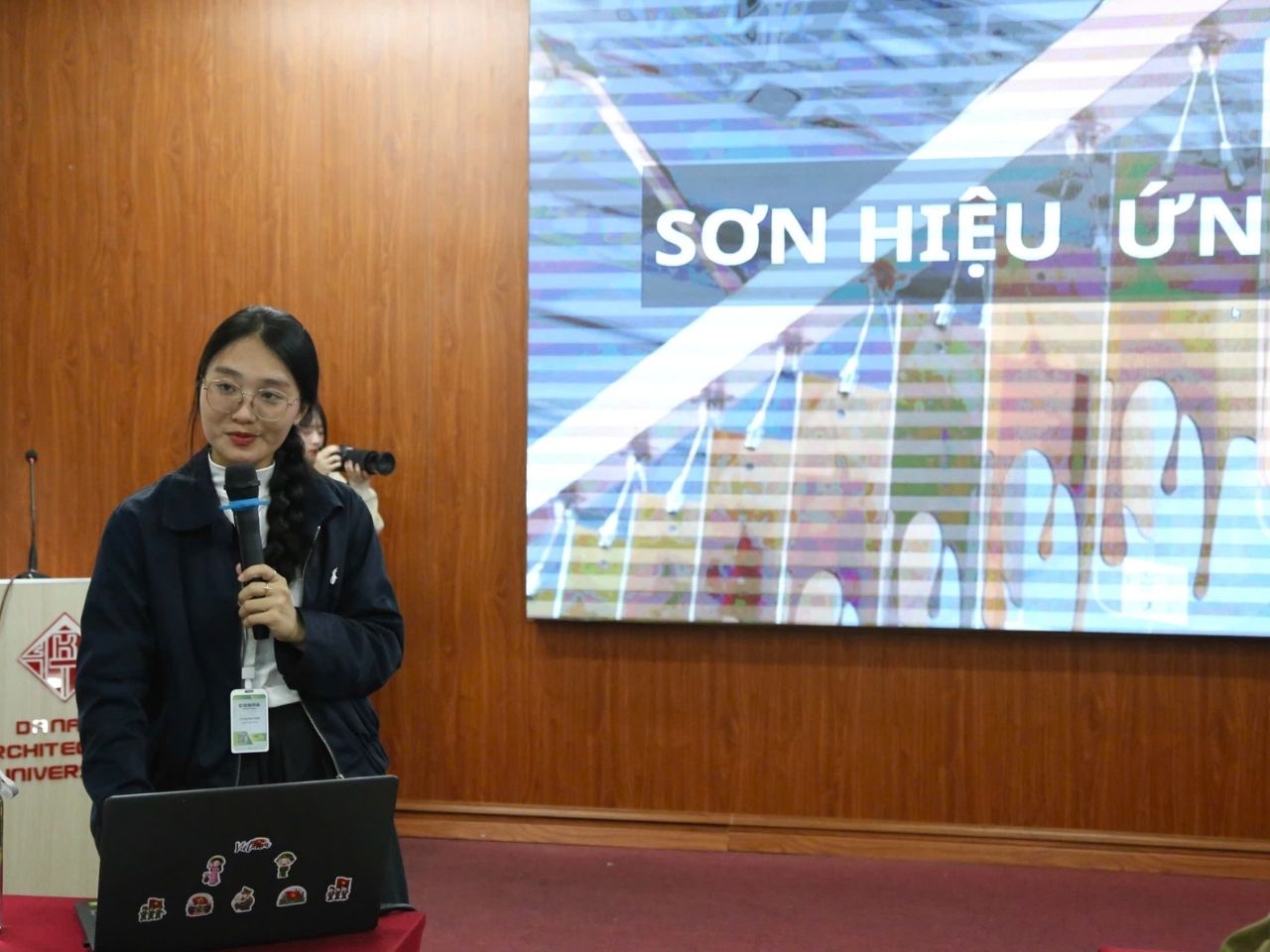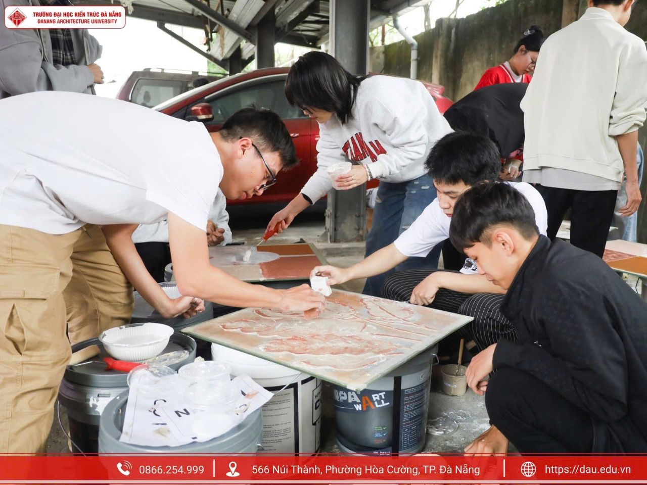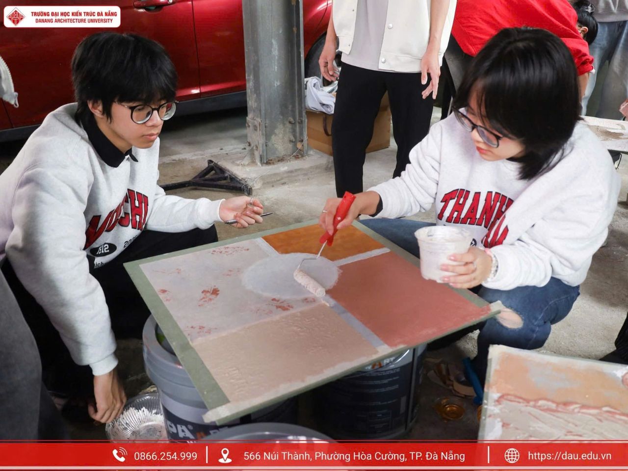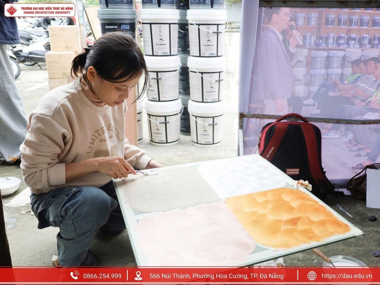 Tại Workshop, sinh viên ngành Thiết kế Nội thất của trường Kiến trúc Đà Nẵng được trực tiếp tiếp cận và trải nghiệm các dòng sơn hiệu ứng, tìm hiểu đặc tính vật liệu cũng như cách ứng dụng màu sắc trong thiết kế nội thất. Thông qua các phần thực hành, sinh viên triển khai ý tưởng trên sản phẩm thật, làm việc nhóm và thực hành ngay tại không gian sân trường dưới sự hướng dẫn của giảng viên và đại diện doanh nghiệp.