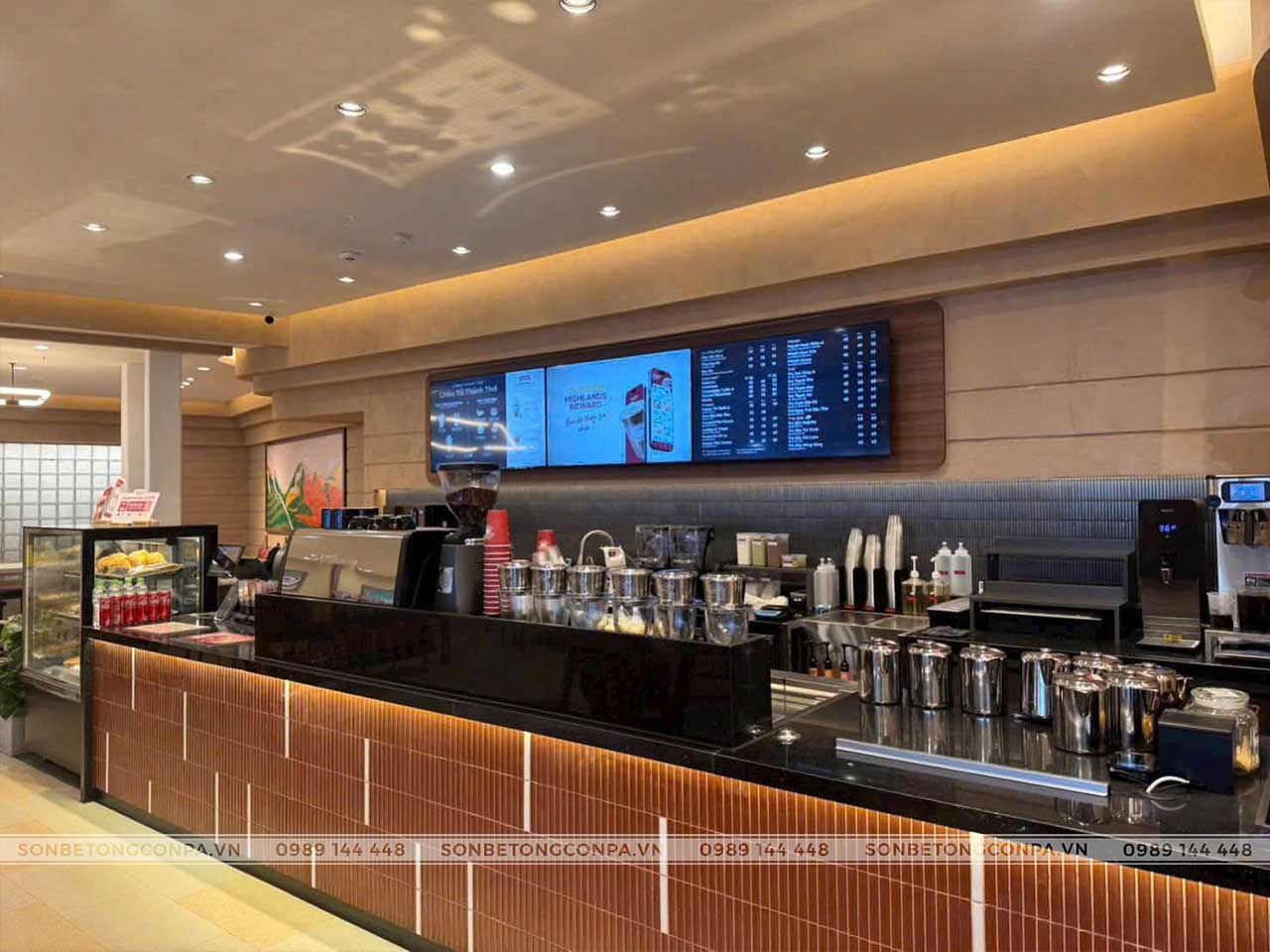 Highlands Coffee được hoàn thiện với sơn hiệu ứng Conpa gam màu trung tính, kết hợp đường nét bo cong và ánh sáng ấm tạo nên không gian hiện đại, tinh tế. Tổng thể quán mang lại cảm giác thoải mái, gần gũi nhưng vẫn giữ được dấu ấn nhận diện đặc trưng của thương hiệu.