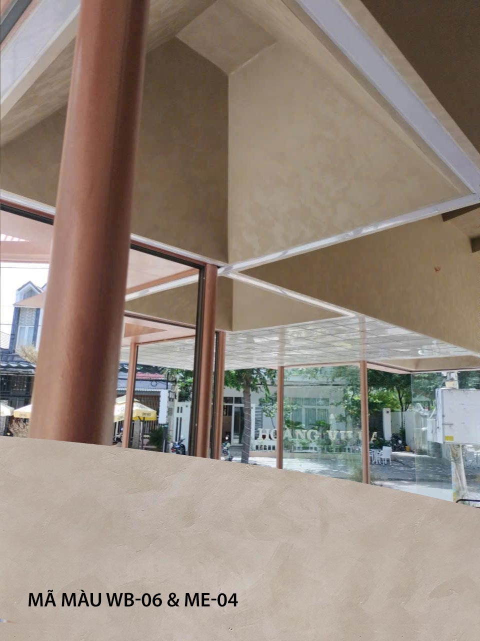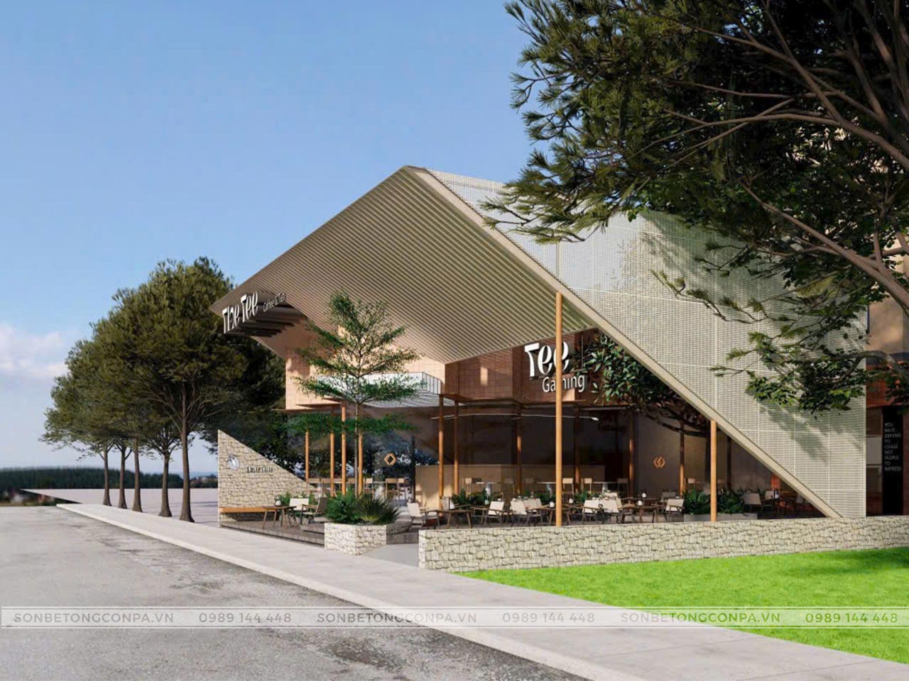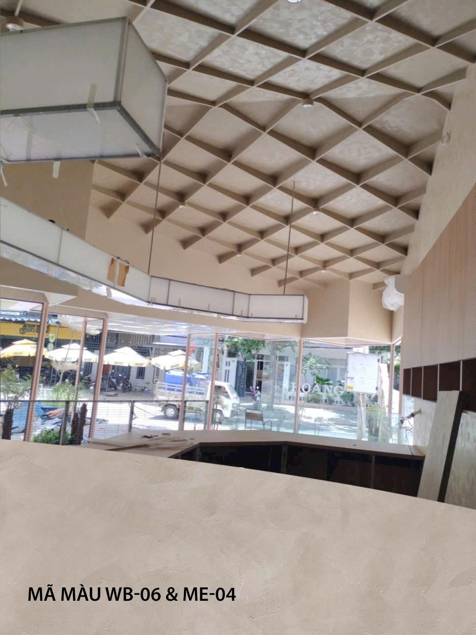 Quán The Tee Coffee & Tea tại Bình Thuận là sự giao thoa hài hòa giữa thiết kế kiến trúc hiện đại và tinh thần tự nhiên bản địa, nổi bật với ba mã màu sơn hiệu ứng CONPA LB05, WB06 và ME04. Sự kết hợp giữa hiệu ứng bê tông và ánh kim tạo nên không gian vừa mộc mạc, vừa sang trọng, vừa ấm áp nhưng vẫn đầy cá tính – khẳng định một tuyên ngôn thiết kế bền vững và thẩm mỹ khác biệt.