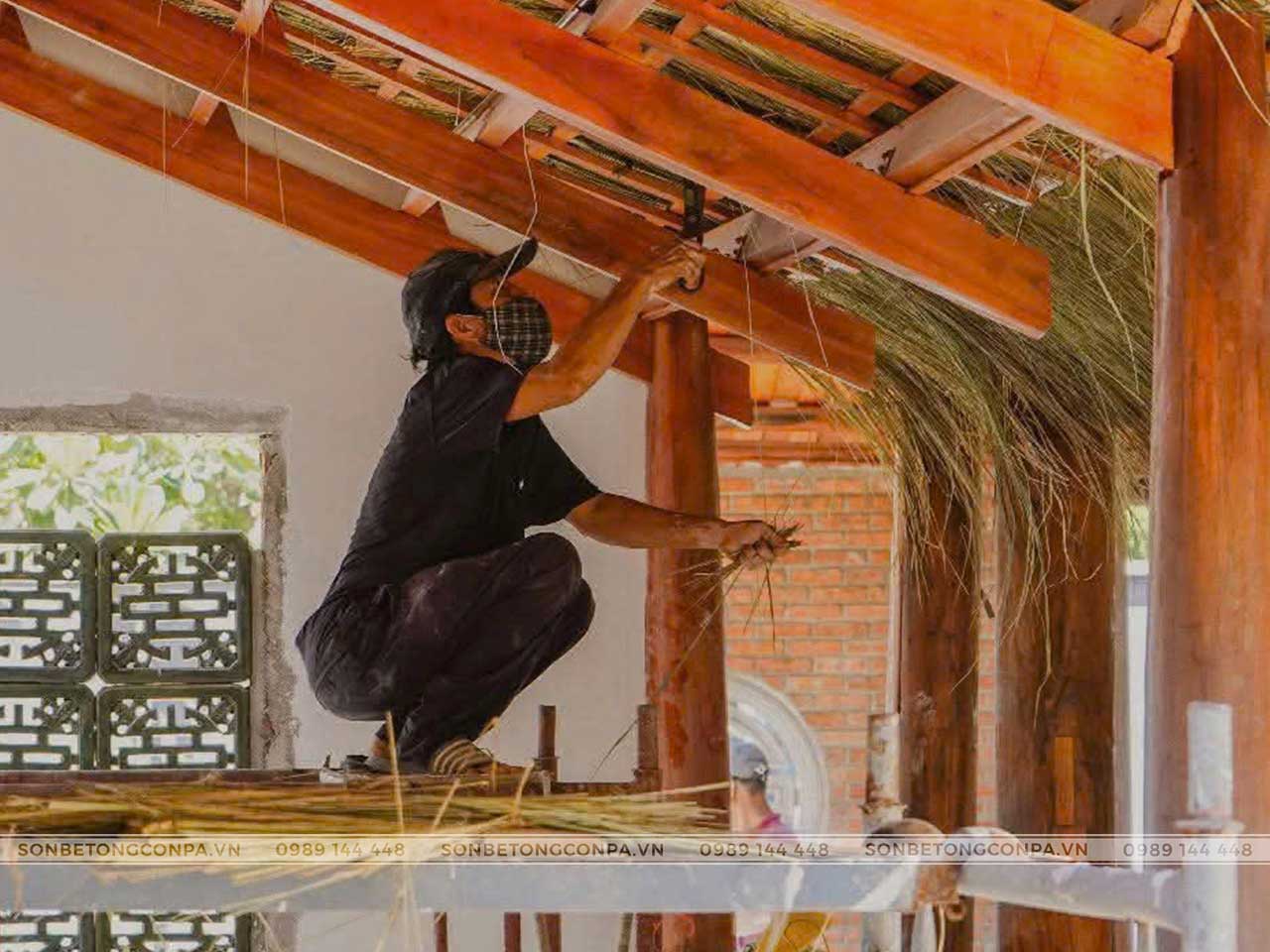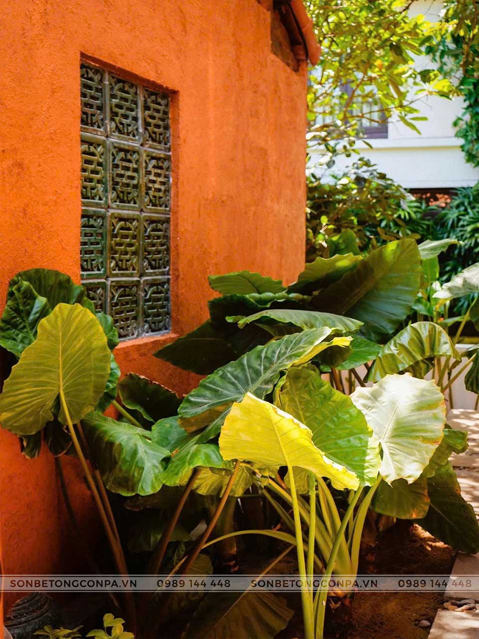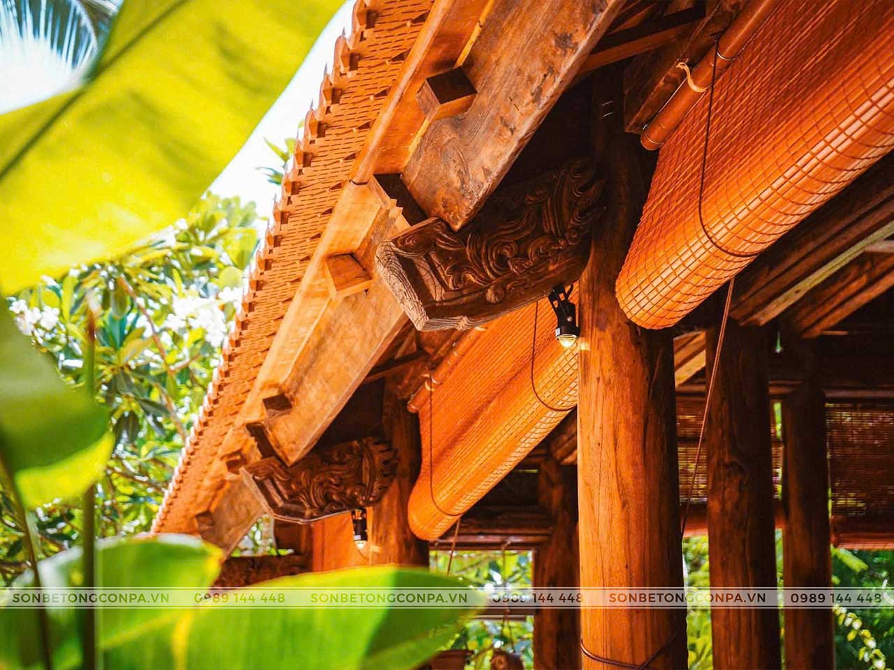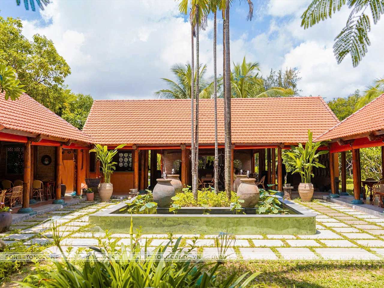 Tông màu đất ấm áp cùng texture mộc mạc giúp không gian mang đậm dấu ấn văn hoá Việt, hòa mình tinh tế vào cảnh quan thiên nhiên và kiến trúc truyền thống nơi đây.