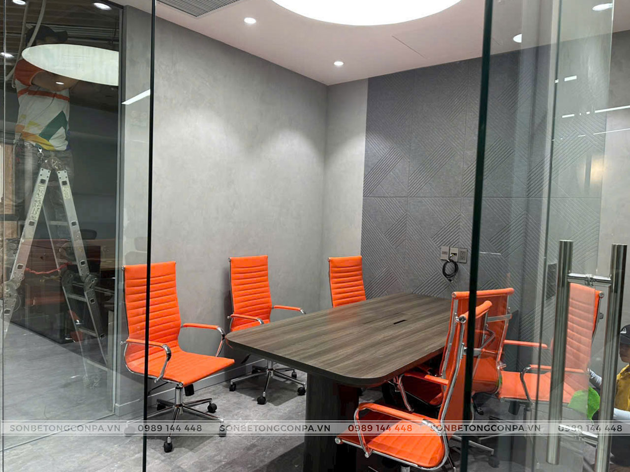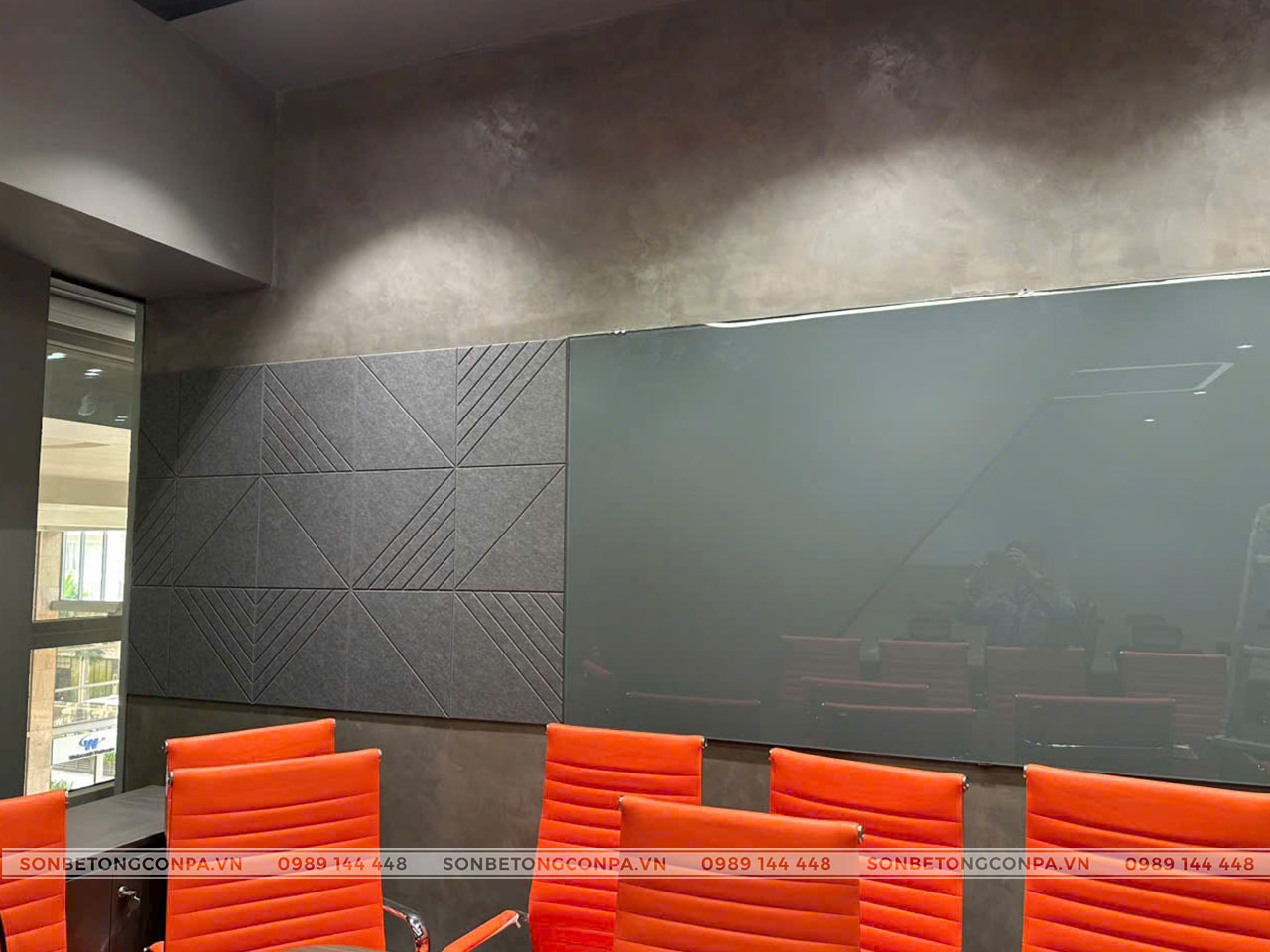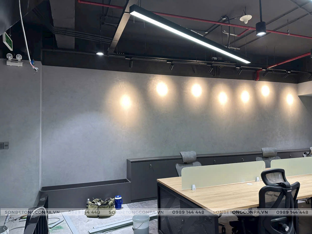 Không gian văn phòng Tevi hiện đại, sang trọng hơn khi lựa chọn ứng dụng sơn hiệu ứng bê tông Conpa tone xám. Tone xám trung tính đem lại sự thoải mái, dễ chịu và dễ dàng tập trung hơn.