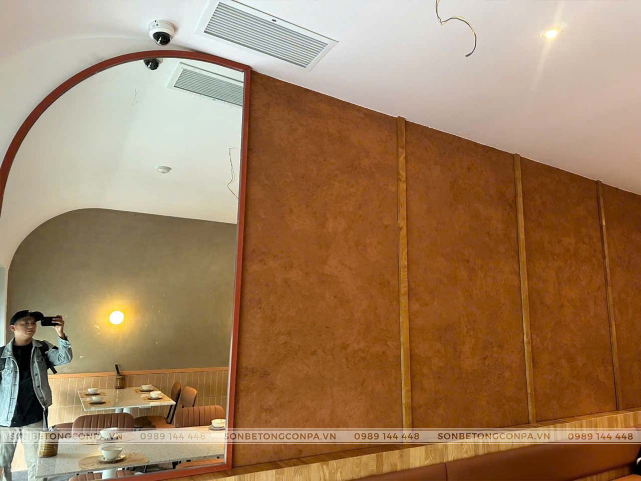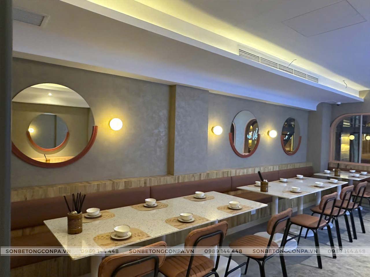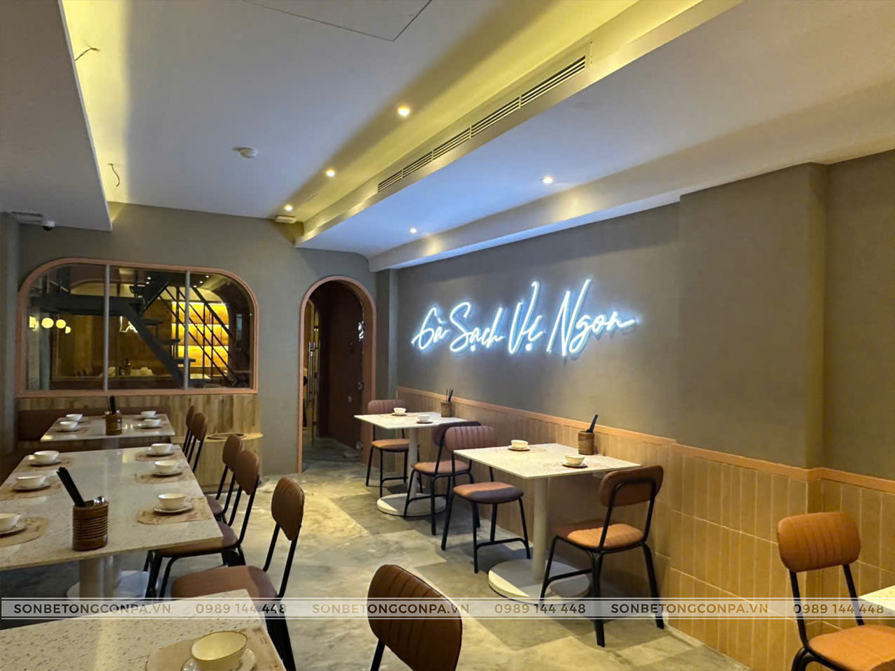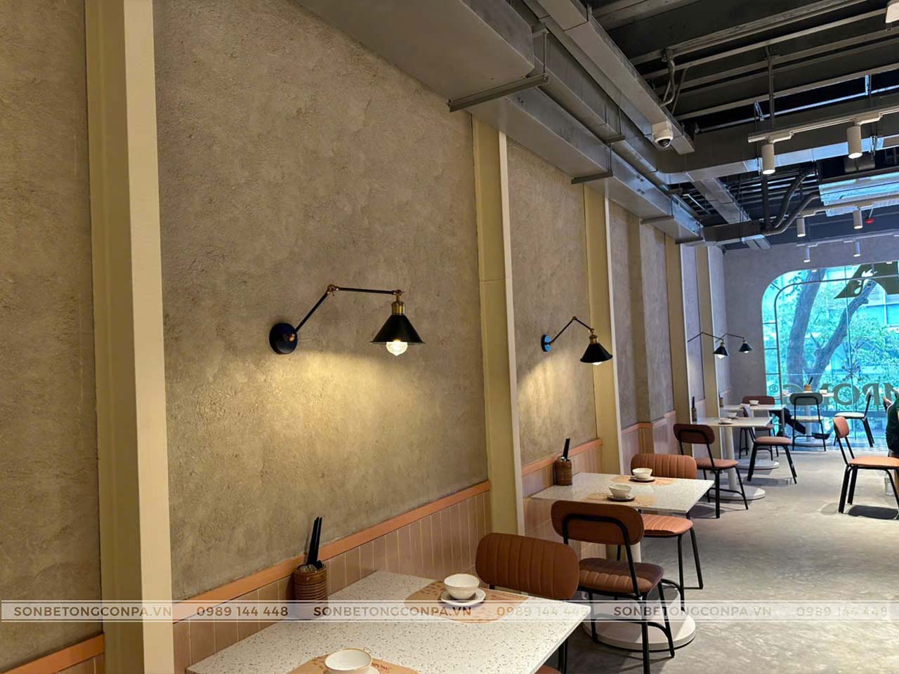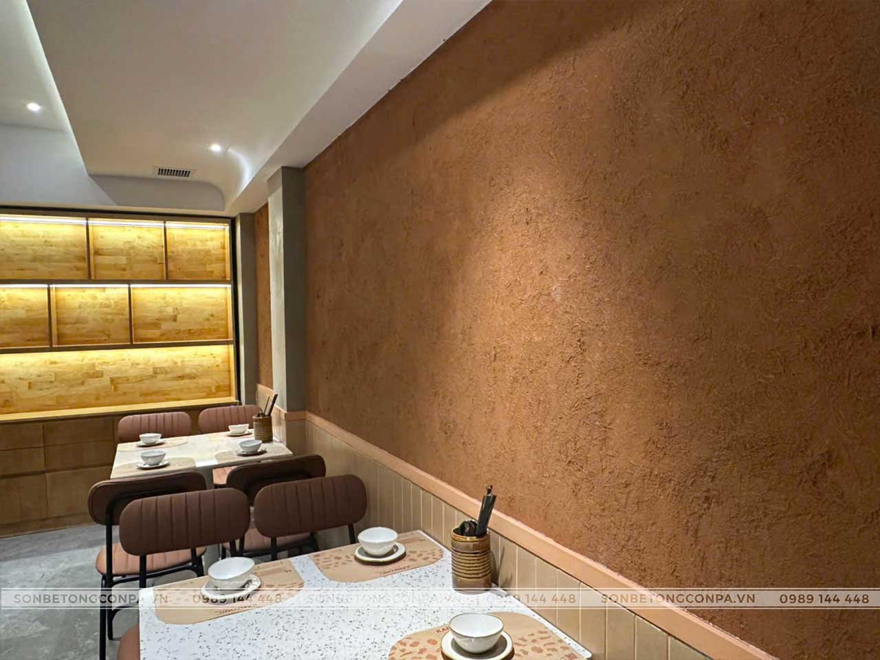 Sự phối hợp độc đáo của dòng sơn rơm đất và hiệu ứng bê tông đã đem lại một không gian cổ điển nhưng không kém phần hiện đại. Gợi mở không gian đồng quê bởi những bề mặt tường rơm đất, đem đến những trải nghiệm đáng nhớ cho thực khách.