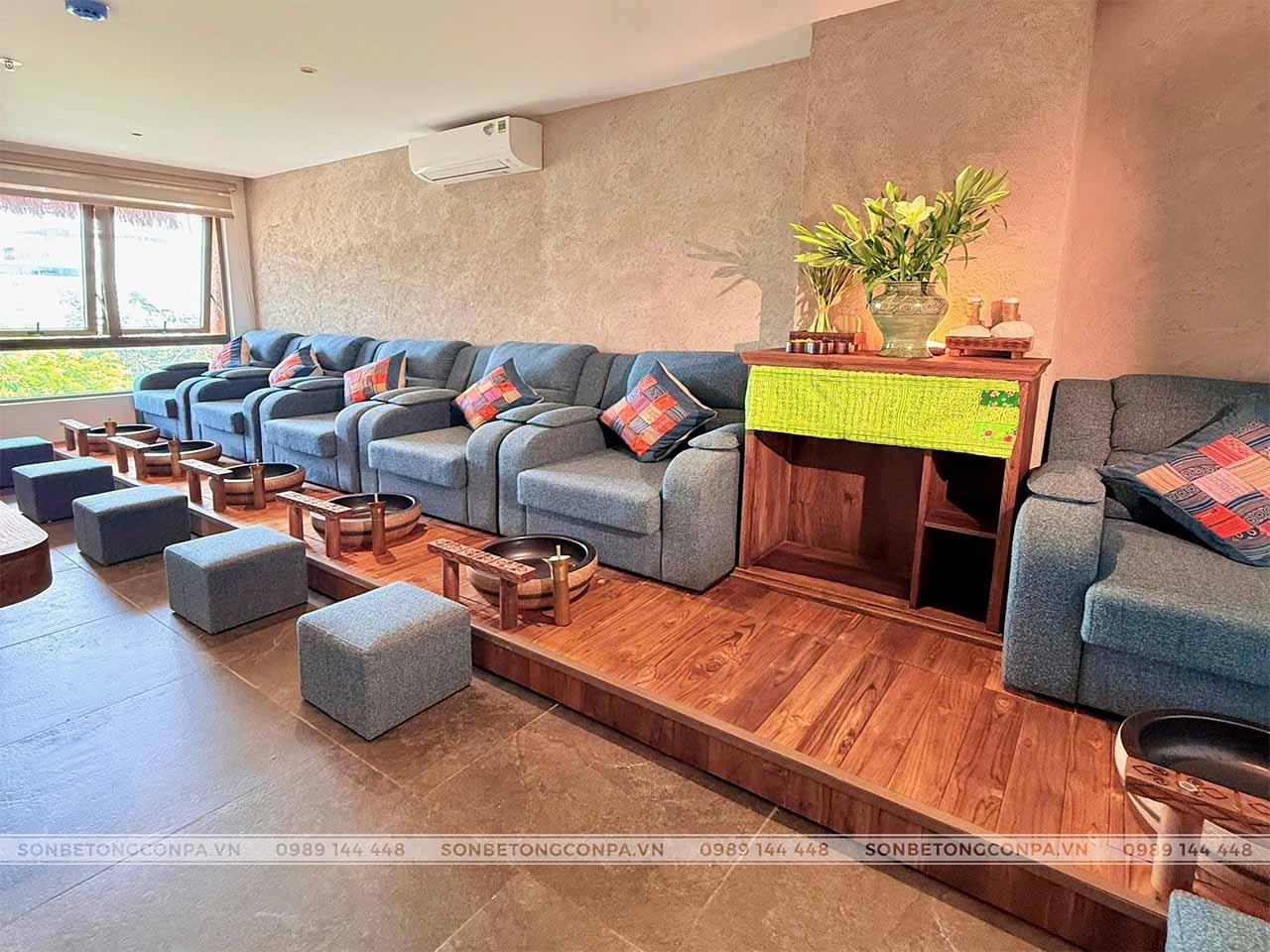 Không gian mặt tiền sử dụng sơn rơm đất Conpa tạo nên cảm giác gần gũi ngay từ ánh nhìn đầu tiên – tinh tế nhưng không phô trương, đủ cuốn hút để khách dừng lại, bước vào và trải nghiệm. Đây chính là lựa chọn lý tưởng cho những spa theo đuổi phong cách tự nhiên – chữa lành – tối giản, nơi mỗi chi tiết đều hướng đến sự cân bằng cả về thị giác lẫn cảm xúc.