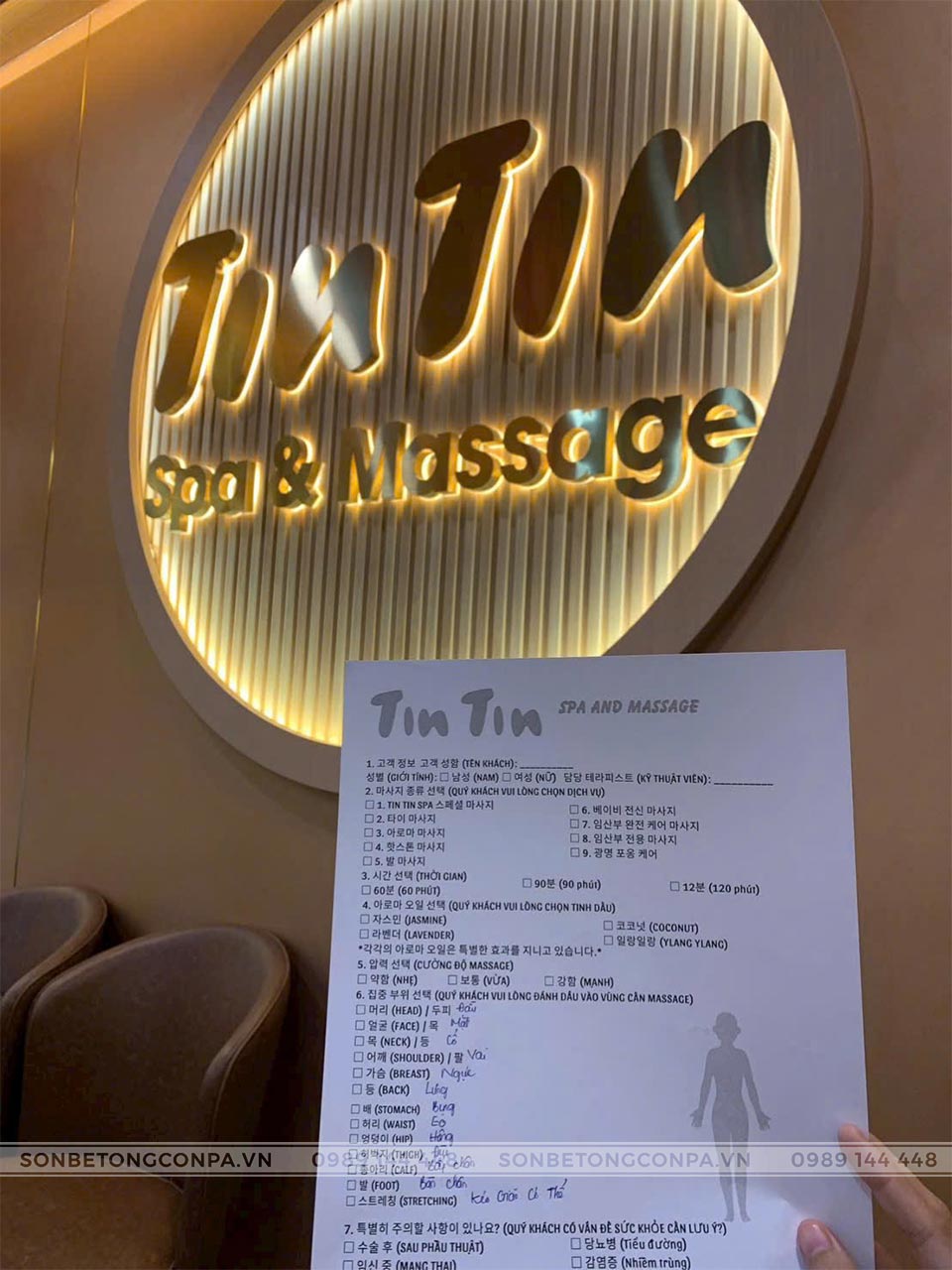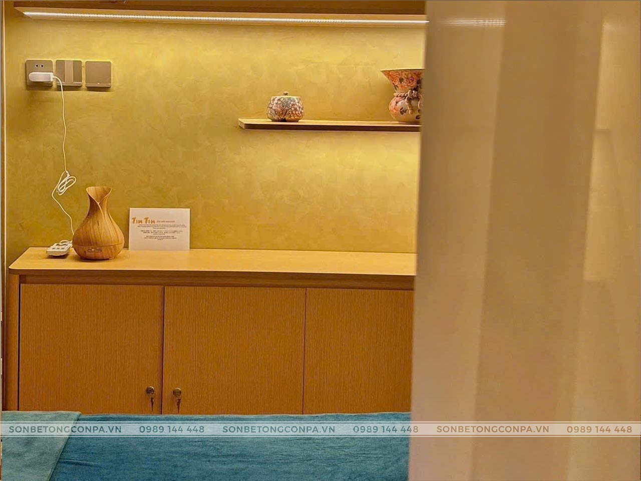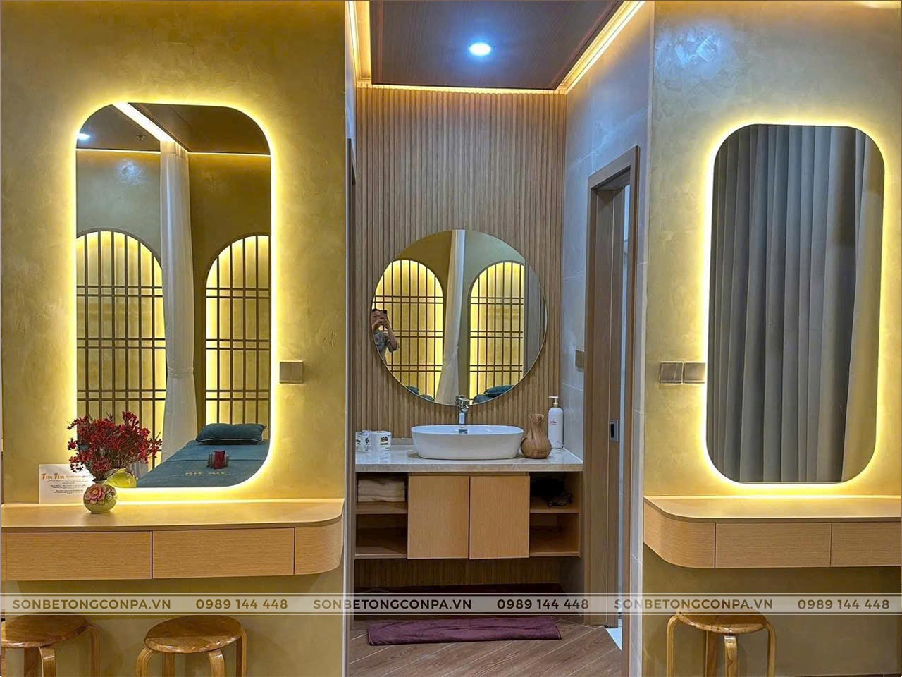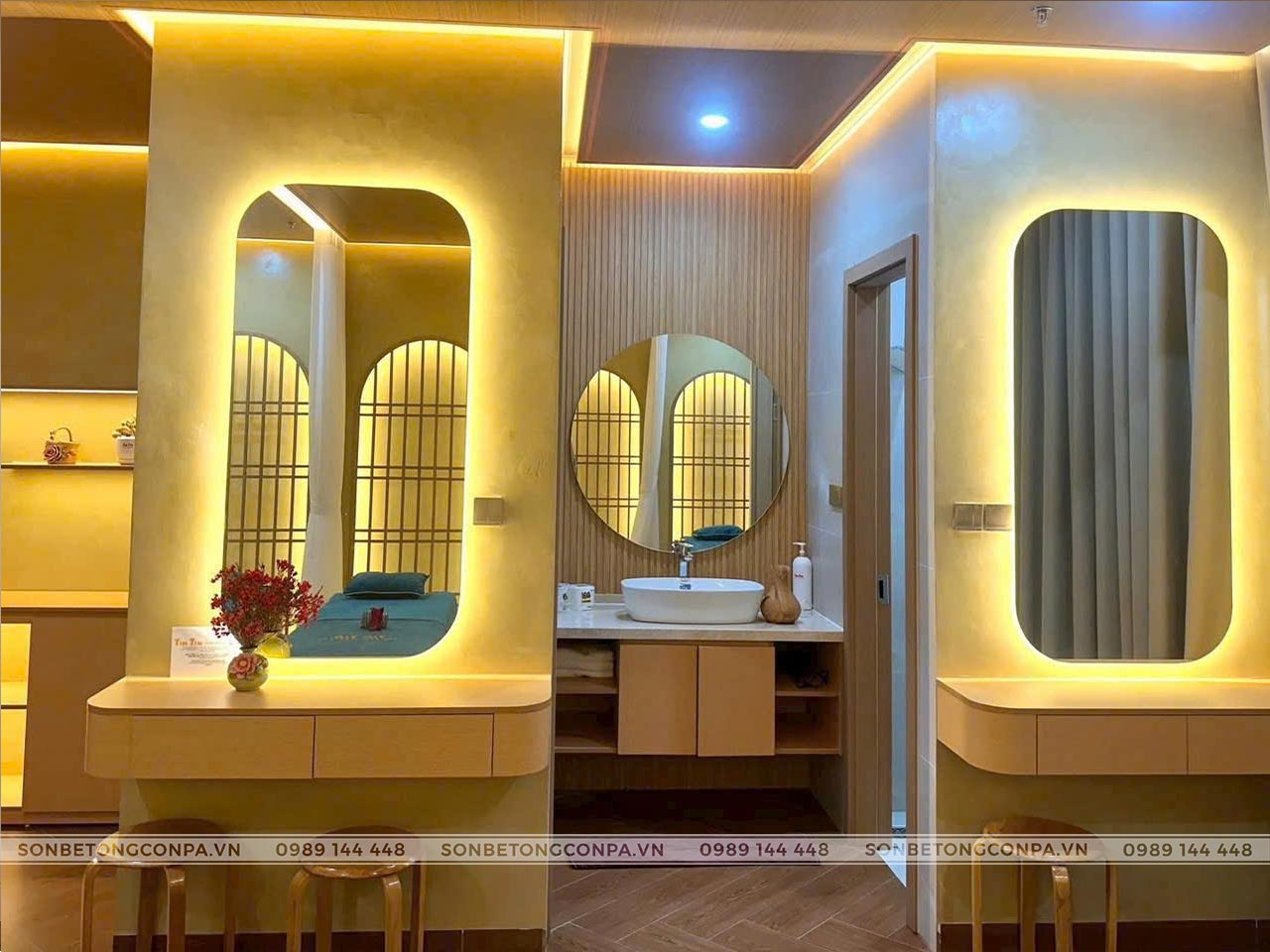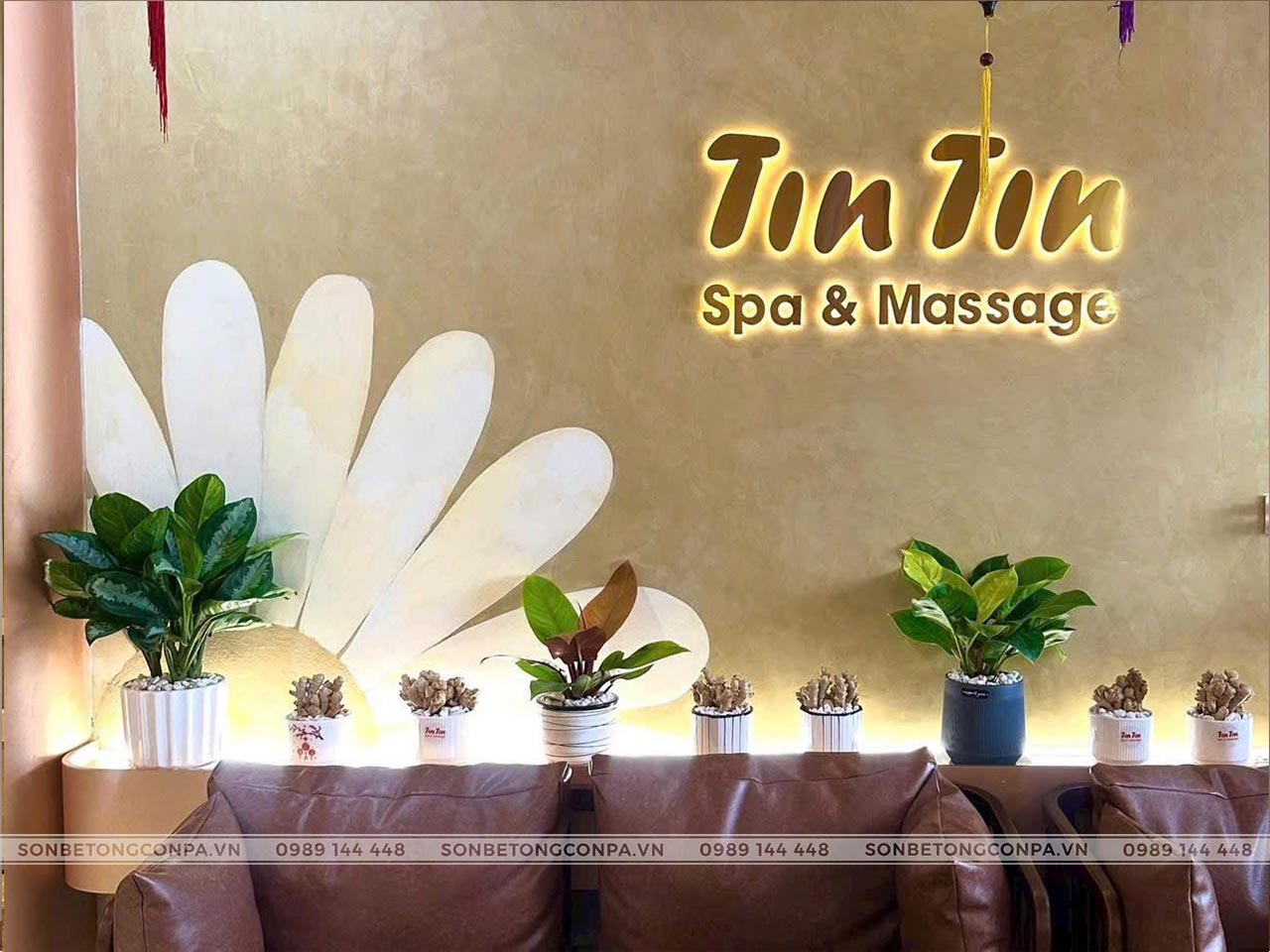 Tin Tin Spa & Massage được hoàn thiện với sơn hiệu ứng Conpa tông vàng ấm, kết hợp ánh sáng gián tiếp và vật liệu gỗ tạo nên không gian thư giãn nhẹ nhàng, sang trọng. Tổng thể thiết kế mang cảm giác ấm cúng, tinh tế, giúp khách hàng dễ dàng thả lỏng và tái tạo năng lượng ngay từ những phút đầu trải nghiệm.