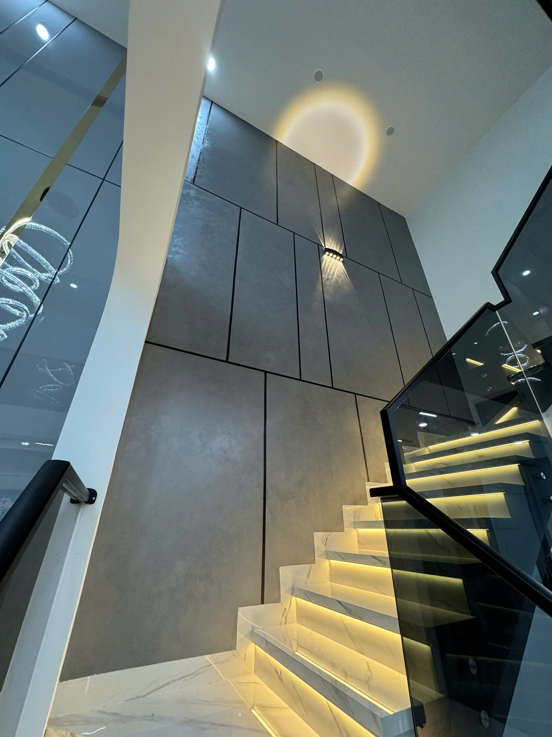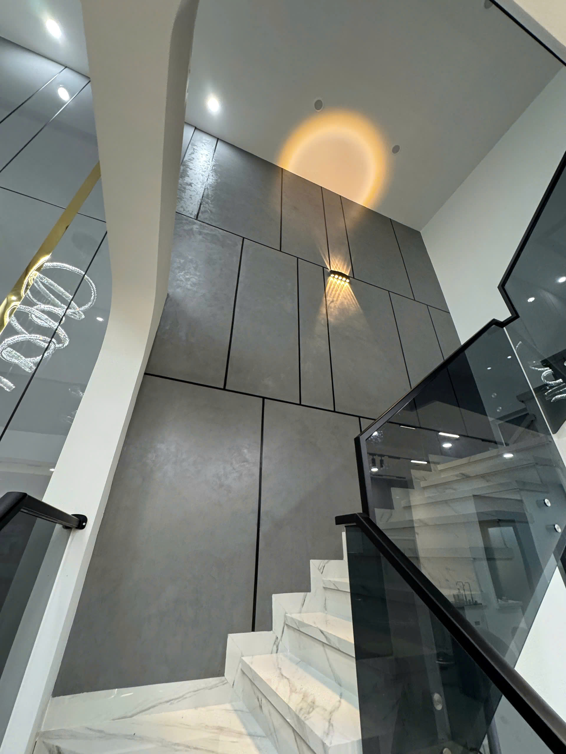 Hiệu ứng kẻ roan không chỉ xuất hiện trên bản vẽ mà đã được ứng dụng rộng rãi trong nhiều công trình thực tế, từ nhà ở đến không gian thương mại. Những mẫu công trình ứng dụng hiệu ứng kẻ roan trong nội thất dưới đây sẽ giúp bạn hình dung rõ hơn về cách kẻ roan kết hợp với màu sắc, chất liệu và bố cục để tạo nên những mảng tường ấn tượng, hiện đại và đầy chiều sâu.